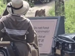 पर्यटकों ने बताया कि शुक्रवार सुबह की पारी में नेशनल पार्क भ्रमण पर गए पर्यटक जंगल सफारी कर वापस लौट रहे थे. सिंहद्वार पर वन विभाग के गाइड और ड्राइवर की डिटेल स्कैन करने के काम में ली जाने वाली क्यूआर कोड मशीन में तकनीकी खराबी आ गई थी, जिसके कारण पर्यटक वाहन वहां खड़े रहे. अचानक बाघिन ‘सुल्ताना’ जंगल से निकलकर गणेश मंदिर मार्ग पर आ गई. बाघिन को देख वहां मौजूद पर्यटक और गणेश मंदिर जाने वाले श्रद्धालु रोमांचित थे.